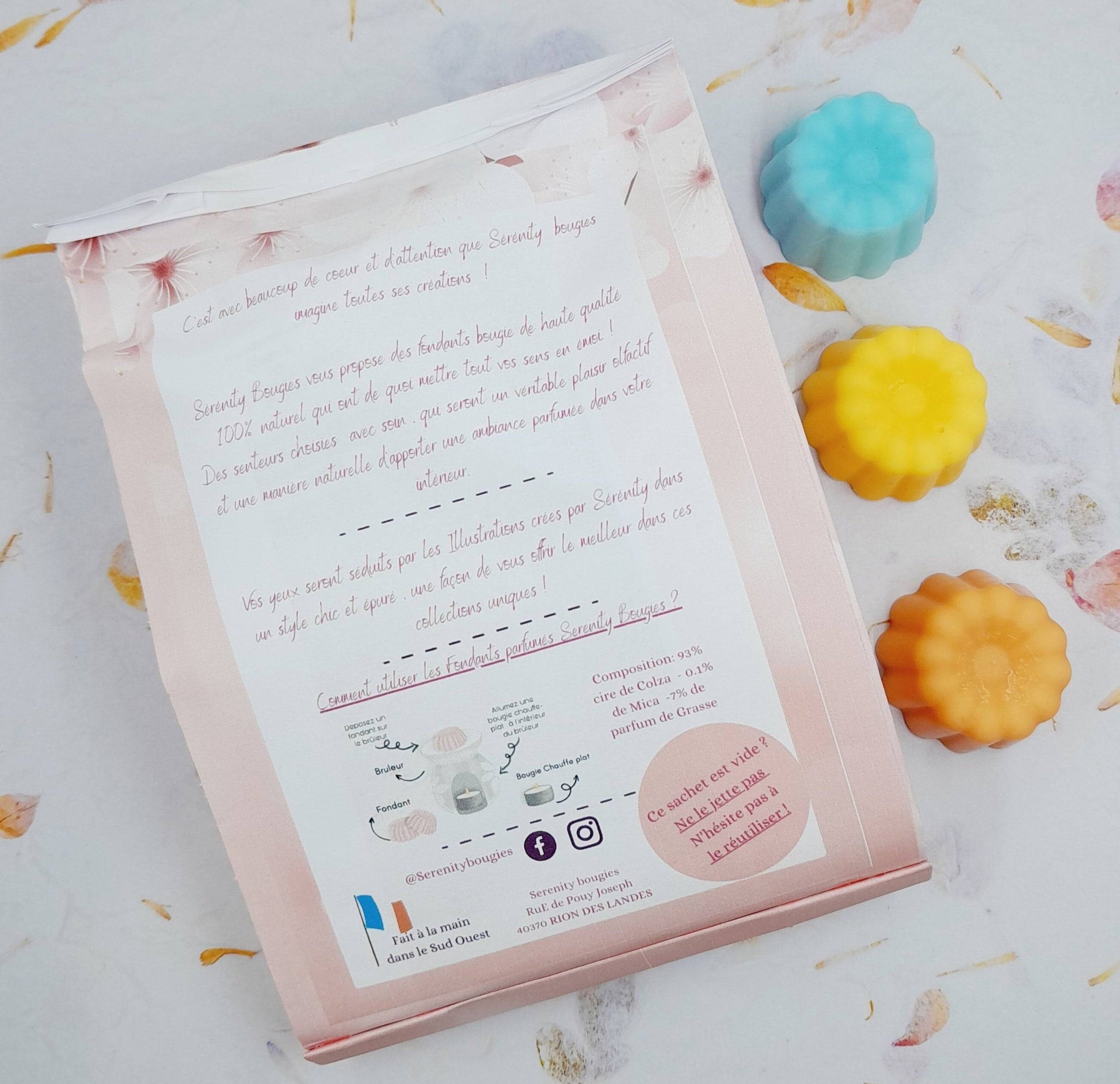 Attention : Les couleurs et les formes des fondants parfumés peuvent changer selon les lots , des paillettes biodégradables peuvent êtres inclus aléatoirement dans certains fondants parfumés .